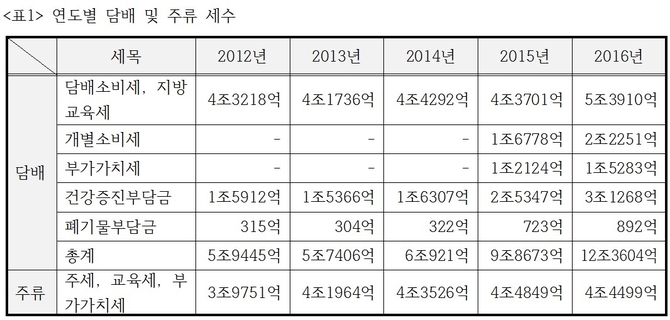 담뱃세 세수와 주세간 격차는 ▲2012년 1조9694억원 ▲2013년 1조5442억원 ▲2014년 1조7395억원으로 담뱃세가 1.5~2조원 가량 더 많았지만, 2015년부터 개별소비세를 새로 과세하면서 격차는 ▲2015년 5조3824억원 ▲2016년 7조9105억원으로 크게 벌어졌다.
