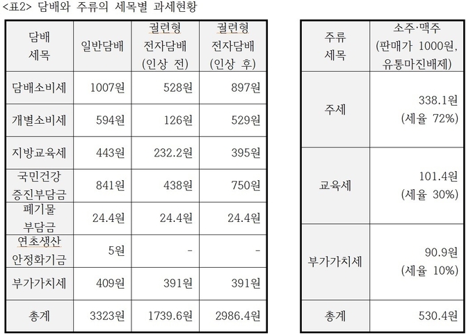 4500원짜리 담배 1갑에 붙는 세금은 준조세 성격까지 포함해 담배소비세 1007원, 개별소비세 594원, 지방교육세 443원, 국민건강증진부담금 841원, 폐기물부담금 24.4원, 연초생산안정화기금 5원, 부가가치세 409원 등 총 3318원에 달한다. 담배에 부과하는 세금은 담배소비세와 지방교육세만 합쳐도 주류에 부과하는 총 세금과 맞먹거나 더 높다.