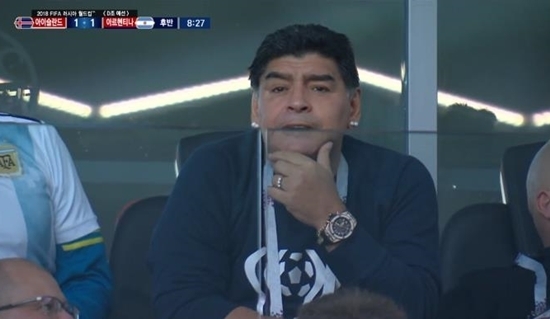 마라도나는 16일 열린 2018 러시아 월드컵 아르헨티나와 아이슬란드의 조별리그 D조 1차전을 관람하기 위해 경기장을 찾았다.