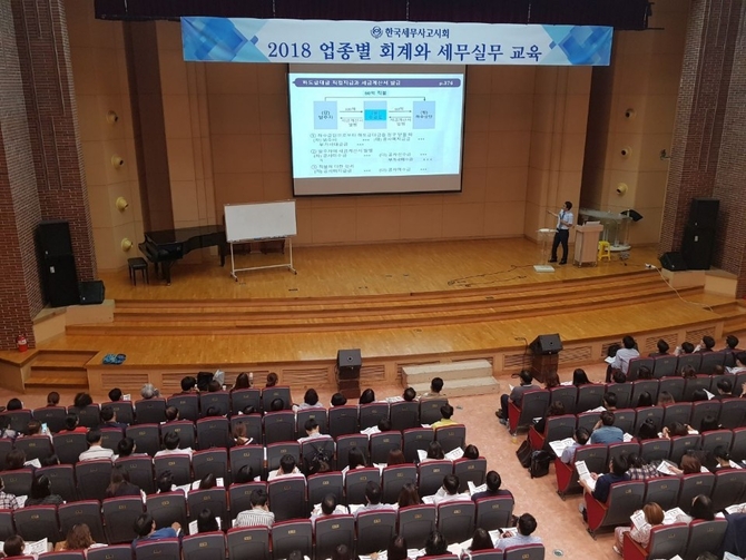 (조세금융신문=고승주 기자) 한국세무사고시회가 12일 오전 10시부터 6시까지 한국교회 100주년 기념관 대강당에서 세무사회 임직원을 대상으로 ‘2018 업종별 회계와 세무실무 교육’을 실시했다.