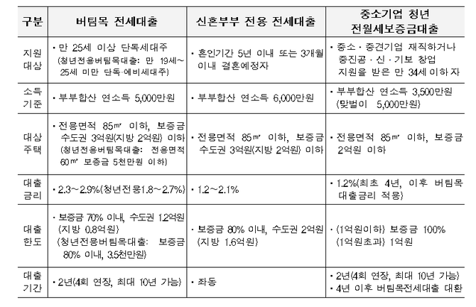 임대보증금 마련이 부담되는 청년, 신혼부부는 정부에서 버팀목전세자금 대출 제도를 운영하고 있으며, 시중 은행(우리·기업·농협·신한·국민)에서 신청인 소득, 신용도 등에 따라 최대 보증금의 80%까지 1.2~2.9%의 낮은 이율로 자금을 지원받을 수 있다.