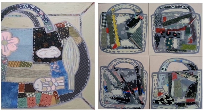 파쇄 시킨 종이들을 풀에 개어서 밑 작업을 하거나, 가방을 만들고 남은 천 조각들을 색채와 구성에 초점을 두고 붙인 뒤 아크릴물감으로 반복하여 칠하는 과정을 통해 자신을 밖으로 꺼내 응시하는 즐거움을 주제로 한다.