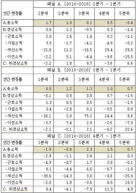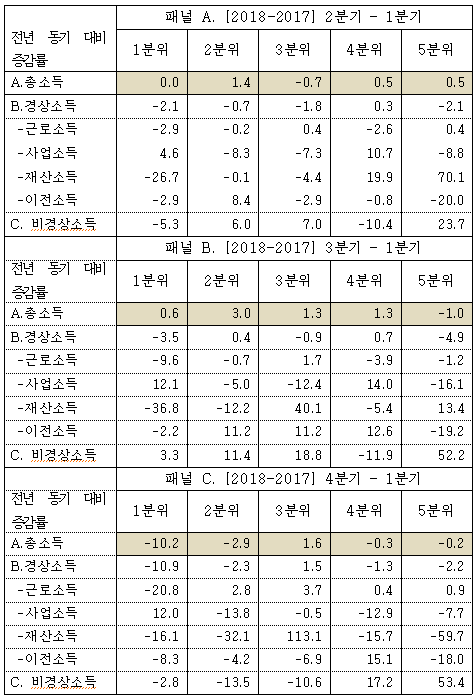 그 결과 소득 1분위의 2018년 2분기 대비 전년동기대비 총소득 증감률은 0.0%, 3분기 0.6%, 4분기 –10.2%로 나타났다.