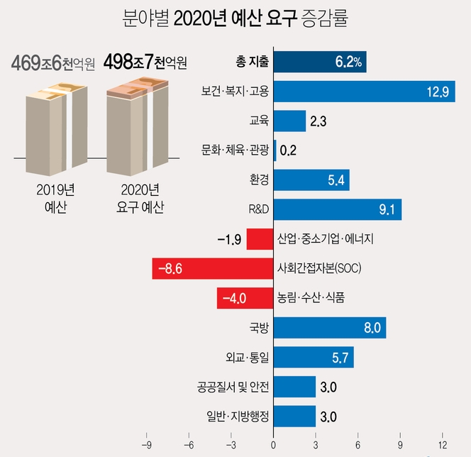 기획재정부는 각 부처별 2020년도 예산·기금 총지출 규모가 올해 예산보다 6.2% 늘어난 498조7000억원이었다고 14일 밝혔다.