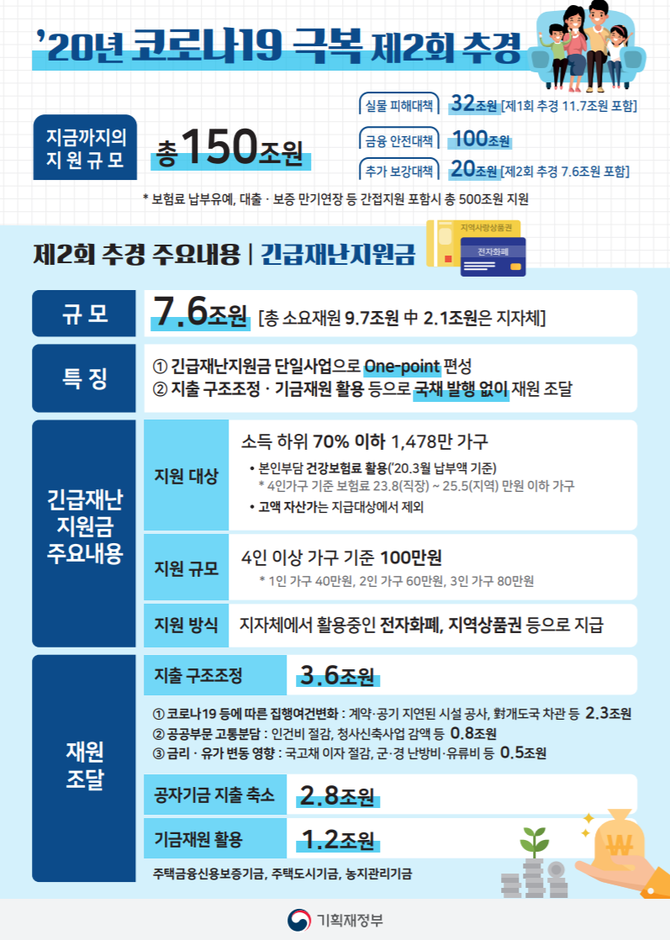 긴급재난지원 대상은 소득 하위 70% 이하 1478만 가구로 1인 가구는 40만원, 2인 가구는 60만원, 3인 가구는 80만원, 4인 이상 가구는 100만원을 지급한다.