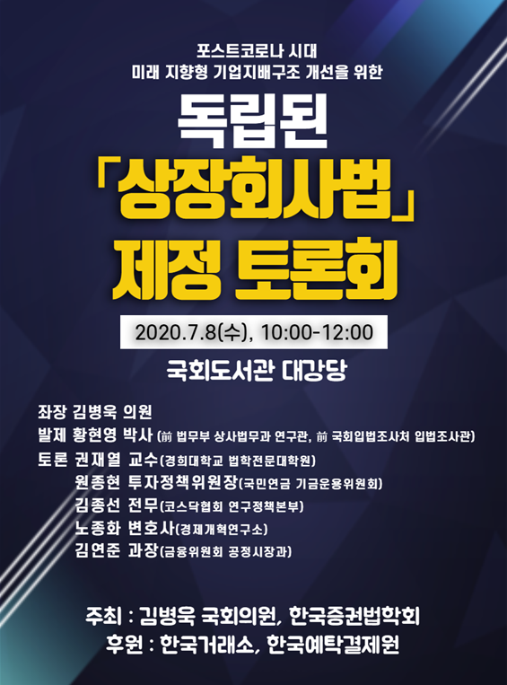 자본시장과 정책 담당자들 사이에서는 포스트 코로나 등 새로운 경제환경의 변화에 맞춰 미래지향형 기업지배구조 개선을 위한 상장회사법 제정에 대한 요구가 높다.