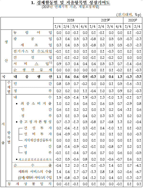 한국은행은 23일 공개한 올해 실질 국내총생산(GDP) 성장률(속보치)에 따르면 2분기 경제성장률은 1분기보다 –3.3%로 나타났다. 지난해 2분기보다는 –2.9% 줄었다.