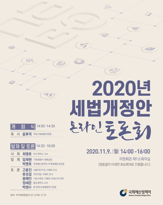 (조세금융신문=고승주 기자) 국회예산정책처가 오는 9일 오후 2시 의원회관 제1소회의실에서 2020년 세법개정안 토론회를 개최한다.