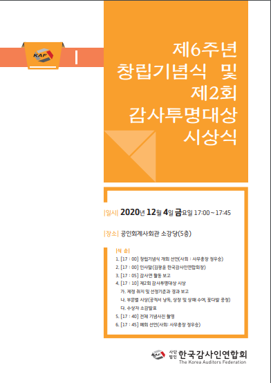 (조세금융신문=고승주 기자) 한국감사인연합회(회장 김광윤)가 내달 4일 오후 5시 서울 서대문구 공인회계사회관 5층 소강당에서 ‘제2회 감사투명대상 시상식’을 연다.