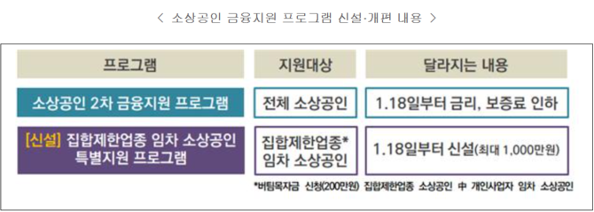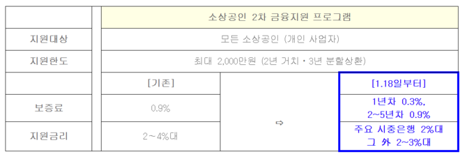 모든 소상공인을 대상으로 '소상공인 2차 금융지원 프로그램'은 1월 18일 신청분부터 인하된 금리와 보증료가 적용된다.