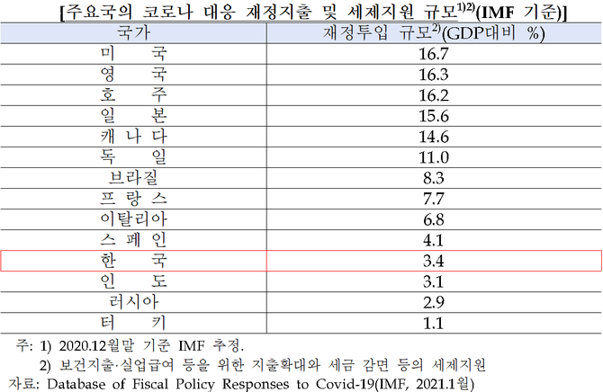 16일 양경숙 더불어민주당 의원이 공개한 IMF ‘주요국의 코로나 대응 재정지출 규모’에 따르면 우리나라의 GDP(국내총생산)대비 재정지출은 3.4%로 경제규모 10위권 국가 중 최하위라고 밝혔다.