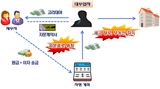 법정최고금리를 초과하는 이자는 관련법에 따라 무효지만, 그는 법망을 피하기 위해 채무자와 자문계약서를 작성하고 이자를 자문료로 위장했다. 원금과 이자는 다수의 친인척 차명계좌로 분산 수취해 소득을 누락했다.