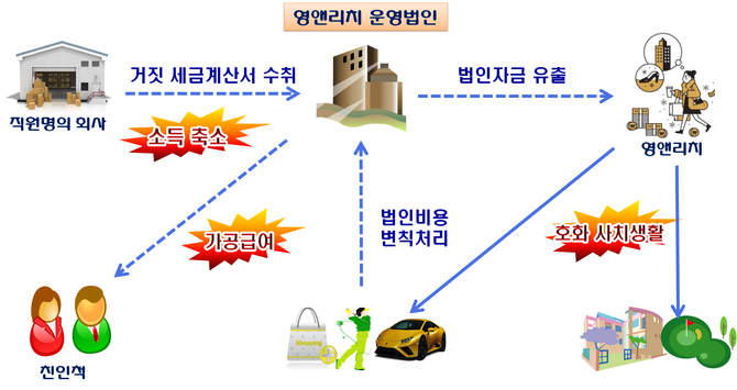매출이 늘자 직원 명의로 유령업체를 설립해 광고비 명목으로 거짓세금계산서를 받아 소득을 누락하고, 친인척 명의로 거짓 인건비를 챙기기도 했다.