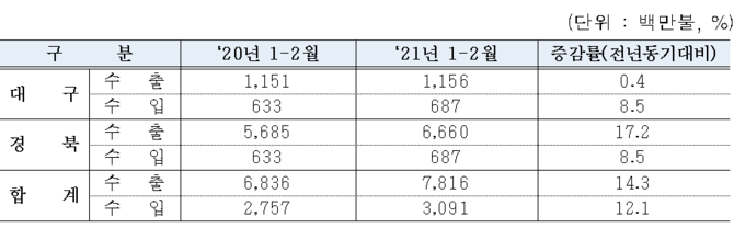 누계 총액으로는 대구·경북지역은 21년 2월말 기준 전년 동기 대비 수출은 14.3% 증가했다. 수입은 12.1% 증가해 무역수지 47억3000만달러 흑자를 기록했다.