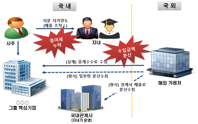 그룹 사주 C는 그룹의 핵심 기업 D의 경영권을 자녀에게 승계(변칙 상속)하기 위한 장기 계획을 수립하고, 지분양도 전 주식가치를 떨어뜨릴 탈세 계획을 꾸몄다.