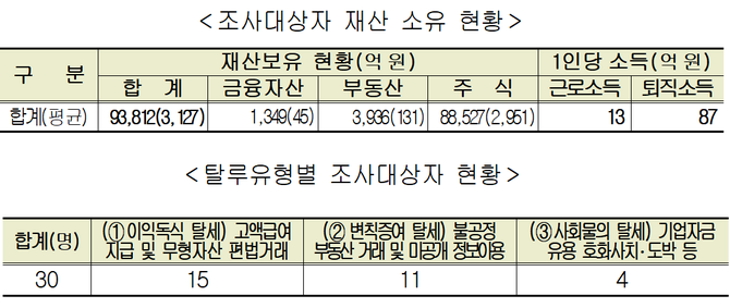 자녀회사에 개발예정 부지 및 사업권을 무상이나 헐값에 넘기고, 상장 및 신제품 개발 등 미공개 정보를 은밀히 제공해 부당한 부를 늘린 변칙증여 혐의자 11명, 이 밖에 회삿돈으로 최고급 아파트‧슈퍼카 등을 사들이거나 도박을 일삼은 탈세 혐의자 4명도 조사대상이다.
