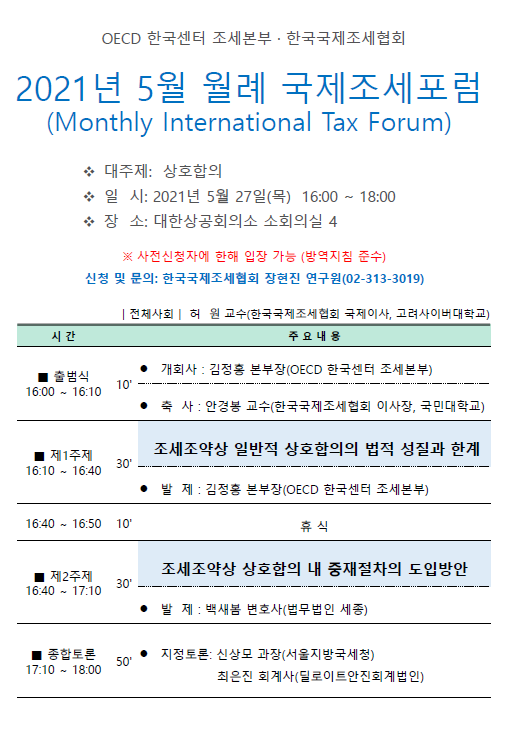 (조세금융신문=고승주 기자) 한국국제조세협회, OECD 한국센터 조세본부가 오는 27일 오후 4시 조세조약 상 상호합의를 주제로 5월 월례 국제조세포럼을 연다.