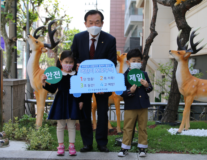 김완일 회장은 자동차 모양의 판넬에 캠페인 슬로건인 ‘1단 멈춤! 2쪽 저쪽! 3초 동안! 4고 예방!’이 새겨진 교통안전 표어를 들고 어린이 교통안전을 최우선으로 하며 안전한 교통문화 정착을 위해 함께 할 것을 다짐했다.