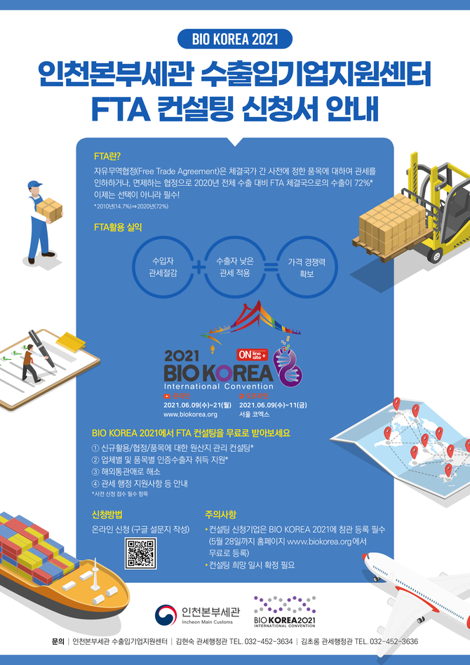 (조세금융신문=홍채린 기자) 인천본부세관은 바이오·헬스 산업의 수출 경쟁력 강화를 위해 'BIO KOREA 2021' 참여 기업을 대상으로 무료 FTA 컨설팅을 실시한다고 밝혔다.