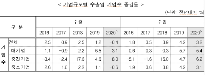 관세청 '기업특성별 무역통계잠정 결과'에 따르면 2019년보다 2020년 수출기업수가 5.5% 감소하고, 수입기업수도 7.1% 감소했다고 분석됐다.