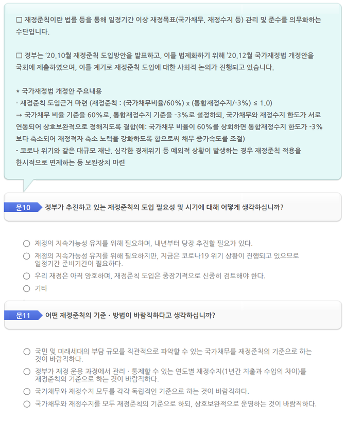 10번과 11번에서도 10번에서는 재정준칙(나랏빚을 되도록 늘리지 않는 기준)이 좋은지 나쁜지를 묻고는 11번에서는 재차 좋은 재정준칙이란 무엇인지를 선택을 요구하고 있다.
