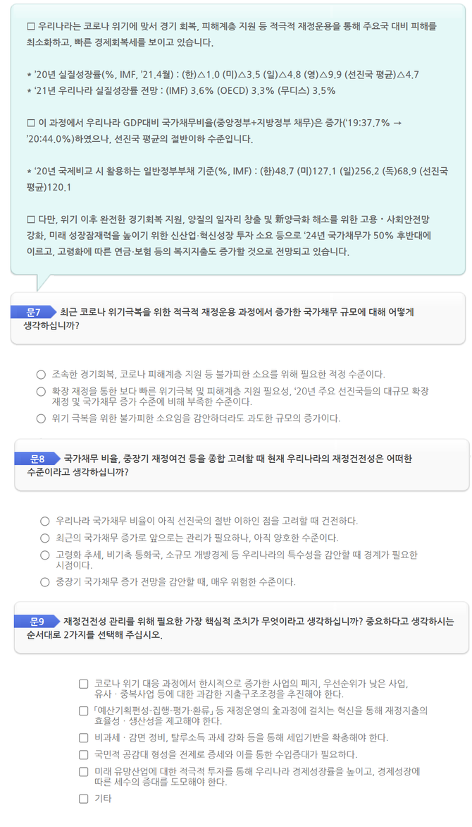 그런데 기재부 설문조사는 7, 8번에서는 나랏돈 지출을 늘려야 하는가 줄여야 하는가를 묻고는 9번에서는 나랏빚을 늘리지 않거나 줄이려면 무엇이 필요한지 물었다.