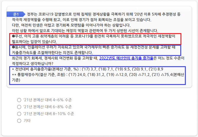 사람은 한번 선택을 하면 뒤에서 자신의 선택을 바꾸기 어렵다. 기재부 설문조사는 1번은 기재부는 코로나 19를 극복하지 못했으니 나랏돈 씀씀이를 늘려야 하느냐 아니면 물가상승으로 나랏빚이 늘어나니 돈 씀씀이를 줄여야 하느냐를 묻고 있다.