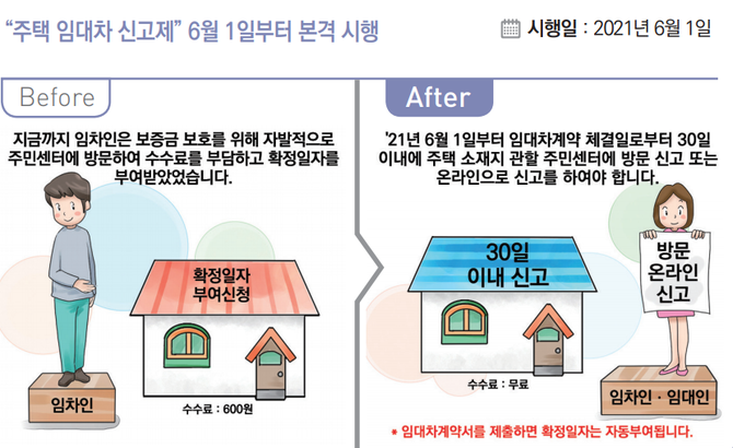임대차 계약 당사자는 6월 1일부터는 임대차 계약을 신규 또는 갱신하는 경우에는 계약 체결일로부터 30일 이내에 주택 관할 주민센터에 방문 신고 또는 온라인으로 신고해야 한다.