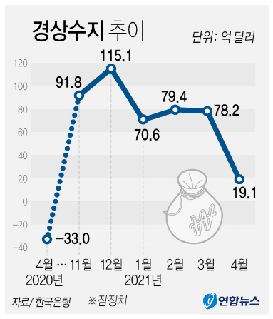 한국은행은 같은 날 '5월 국제수지(잠정)' 결과를 내놓는다. 앞서 4월 경상수지는 19억1천만달러(약 2조1천249억원) 흑자로 집계됐다.