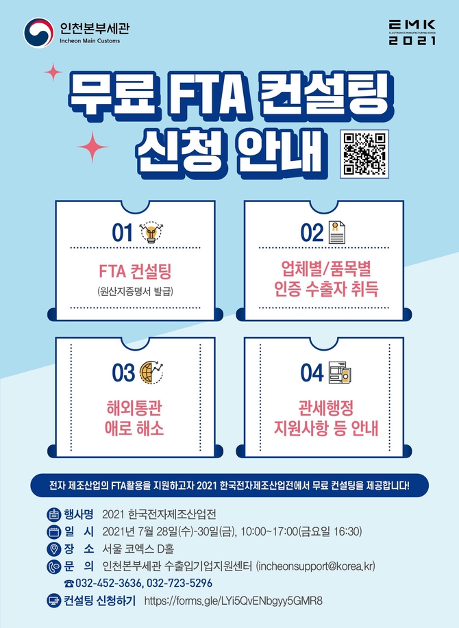 이번 전시는 2021년 7월 28일(수)부터 30일(금)까지 3일간 코엑스에서 개최된다. 인천본부세관은 △FTA 활용을 위한 원산지 증명서 발급 상담, △업체별/품목별 인증수출자 취득 지원, △해외통관애로 상담, △기타 관세행정 지원사항 등 무료 현장 컨설팅을 지원한다.