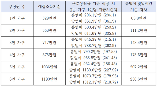 혼자 월 700만원 정도를 버는 3인 가구와 부부 둘이서 각각 350만원 버는 3인 가구를 동일선상에 둘 수 없다는 판단에서다.