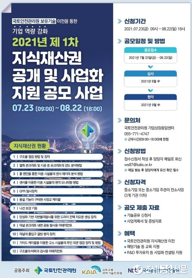 (조세금융신문=구재회 기자) 국토안전관리원은 기관이 보유한 특허 기술을 무상 이전해 건설·시설 안전 분야 중소기업을 지원하는 '지식재산권 공개 및 사업화 지원' 공모를 시행한다.