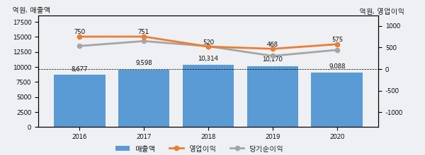 애경유화의 2020년 매출액은 전년대비 -10.6% 줄어든 9088억원이고, 영업이익은 전년대비 22.7% 늘어난 575억원을 기록했다. 이 회사의 매출액 증감률과 영업이익 증감률은 각각 코스피 하위 30%, 상위 37%에 해당된다.