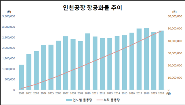 2001년 120만 톤이였던 인천공항 항공화물 물동량은 매년 실적이 점차 개선되면서, 2007년 255만 톤으로 2001년 대비 113% 증가까지 기록했다. 하지만 2008년 미국 금융위기 여파로 물동량이 2009년 231만 톤까지 하락했다. 이는 2007년 대비 △9% 감소한 것이다.