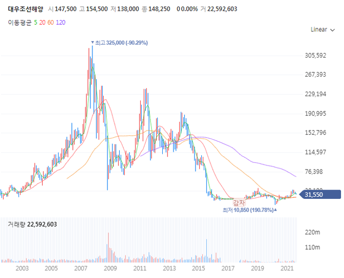 이후 2013년 11월 29일 18만3500원을 찍은 후 하락장을 거듭했는데 당시 글로벌 조선업계 경기 불황이 이어지고 있었다.