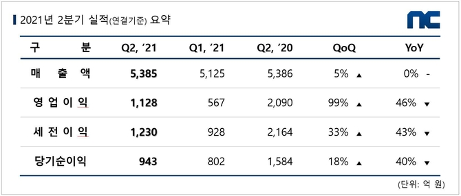(조세금융신문=이정욱 기자) 엔씨소프트(엔씨)가 2021년 2분기 연결 실적 결산 결과 매출 5385억원, 영업이익 1128억원, 당기순이익 943억원을 기록했다고 11일 밝혔다.