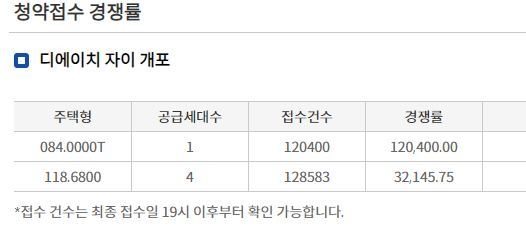 한국부동산원 청약홈에 따르면 이날 진행된 디에이치 자이 개포의 경쟁률은 1가구가 나온 전용면적 84㎡B 타입의 경우12만400대 1, 4가구가 나온 118㎡A 타입의 경우 3만2145.75대 1에 달했다.
