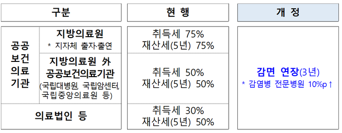 단, 감염병 전문병원의 취득세와 재산세는 각각 10%p씩 추가로 감면된다. 감염병 연구‧예방, 전문가 양성 등을 위해서다.