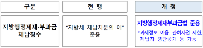 지방행정제재부과금 관련 법률(56개)을 지방행정제재부과금법을 준용하도록 했다. 이에 따라 지방행정제재부과금을 징수할 때도 과세정보 이용, 관허사업 제한, 체납자 명단공개 등을 이용할 수 있게 됐다.