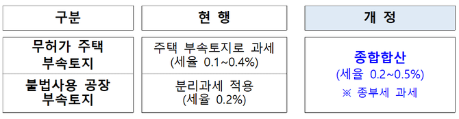 (조세금융신문=고승주 기자) 무허가 주택 부속토지 및 공장 부속토지를 불법사용했을 경우 종합합산 과세한다.