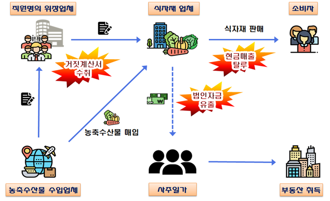 그러면서 직원명의 위장업체를 끼워 넣어 원산지를 국산으로 둔갑시킨 농축수산물을 판매하고, 실제 거래보다 과다하게 거짓계산서를 수취하여 원가를 부풀렸다.