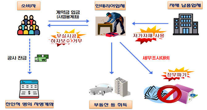 인테리어업체 대표 B씨는 부실시공 후 하자보수를 거부해 소비자에 피해를 주고 저가자재 사용으로 폭리를 취하면서 현금 수입을 탈루했다.