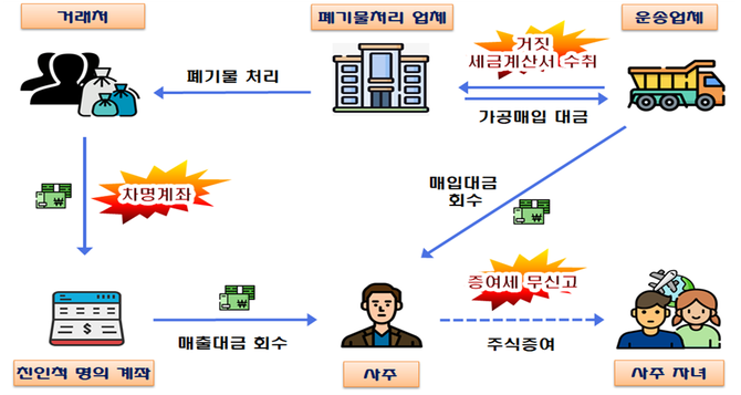 폐기물처리 업체 사주 A는 급증하는 폐기물을 독점처리하면서 매출이 크게 늘어나자 대금을 친인척 명의의 차명계좌로 입금받고 거래처로부터 거짓세금계산서를 수취하는 방식으로 소득신고를 빠져 나가려 했다.