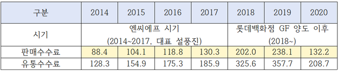엔씨에프가 롯데백화점 글로벌 사업부와 통합해 롯데GFR이 출범한 2018년 사업연도가 중점 점검 대상으로 관측된다.