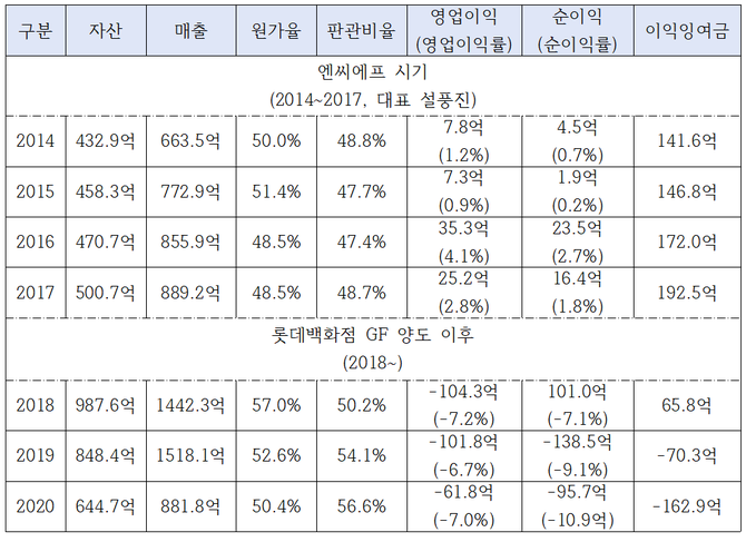 롯데GFR은 설 대표가 있었던 엔씨에프 시절에는 48.0% 선을 망가뜨리지 않았다. 2014년 48.8%, 2015년 47.7%, 2016년 47.4%, 2017년 48.7% 등이다.