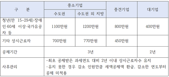 대기업 2년, 중견‧중소기업은 3년간 세액공제를 받을 수 있고, 중소기업의 경우 사회보험료 인하혜택까지 누릴 수 있다.