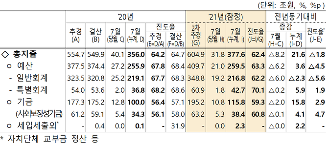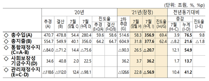 총지출은 7월까지 377.6조원이 집행됐다. 소상공인 피해지원, 사회안전망 강화, 코로나 방역 대응 등으로 중심으로 전년동기대비 21.6조원 씀씀이가 늘었다.