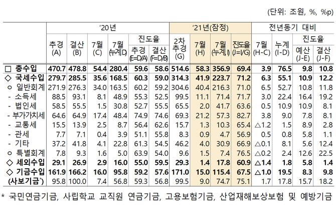 올해 연간 세수목표치 중 7월까지 달성률(진도율)은 지난해보다 12.2%p 증가한 71.2%로 집계됐다.