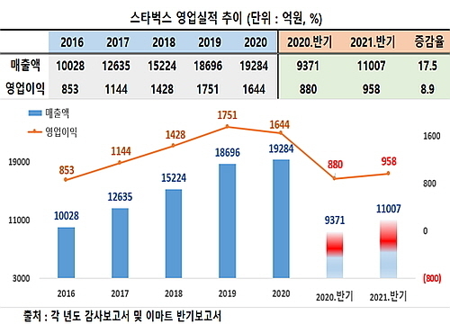 이마트 반기보고서에 따르면 스타벅스는 올 상반기에 1조1007억 원의 매출을 올려 지난해 상반기 9371억 대비 약 17.5% 성장했고, 영업이익 또한 8.9% 늘어난 958억 원을 기록함으로써 코로나 상황임에도 외형과 손익 모두 전년 동기대비 크게 개선시키는 선전을 펼쳤다.