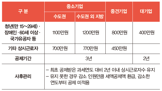 사회보험료 세액공제의 경우 청년 및 경력단절 여성 채용의 경우 100%, 이외 상시근로자를 늘린 경우 50%(신성장 서비스업종은 75%)에 달한다. 다만, 세액공제를 받으려면 최초 공제받은 과세연도 대비 2년 이내 상시근로자수가 감소하면 안 된다.
